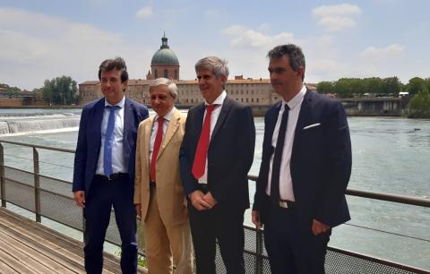 De gauche à droite : Franck Darthou, directeur d’EDF Hydro Sud-Ouest, délégué de bassin et coordonnateur de l’eau Grand Sud-Ouest, Etienne Guyot, préfet de la région Occitanie, préfet de la Haute-Garonne, préfet coordonnateur du bassin Adour- Garonne, Jean-Michel Fabre, président du Smeag et Guillaume Choisy, directeur général de l’agence de l’eau Adour-Garonne.