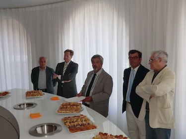 « Nous visons les 40 % de CA à l’export d’ici 2014, contre 30 % actuellement » explique le DG des Vignerons catalans, Daniel Dumanois, lors de l'inauguration des nouveaux espaces de réception. Ce nouvel espace de réception s’inscrit pleinement dans notre politique stratégique à l’export ». Après d’importants travaux de rénovation et d’aménagement (coût : 220 000 €), cet espace est doté d'une salle de réunion (30 personnes), d'une salle de travail (6 personnes), d'un salon de réception et d'une salle de dégustation (8 postes) et de présentation des vins. Le groupement de producteurs apporte « une nouvelle touche de modernité à son site en restant dans la tradition », remarque René Bidal, préfet des P.-O., présent pour l’occasion. « On ne peut pas commercialiser plus de 25 millions de bouteilles dans le monde, réaliser un chiffre d’affaires de 60 M€, sans pouvoir accueillir nos clients, fournisseurs visiteurs dans des lieux adaptés. Ces nouveaux espaces de réceptions donnent aux Vignerons catalans l’image qu’ils méritent » déclare Louis Malet, président du groupement de producteurs* (au centre sur la photo, devant une table de dégustation réalisée par la société ID Wine, menuisier d'art).