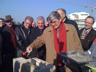 Raoul Cros, président de la Mutualité Française Hérault et Etienne Caniard, président de la Mutualité Française, ont posé jeudi 9 février la première pierre d’un pôle de services dans la Zac des Grisettes, à Montpellier.